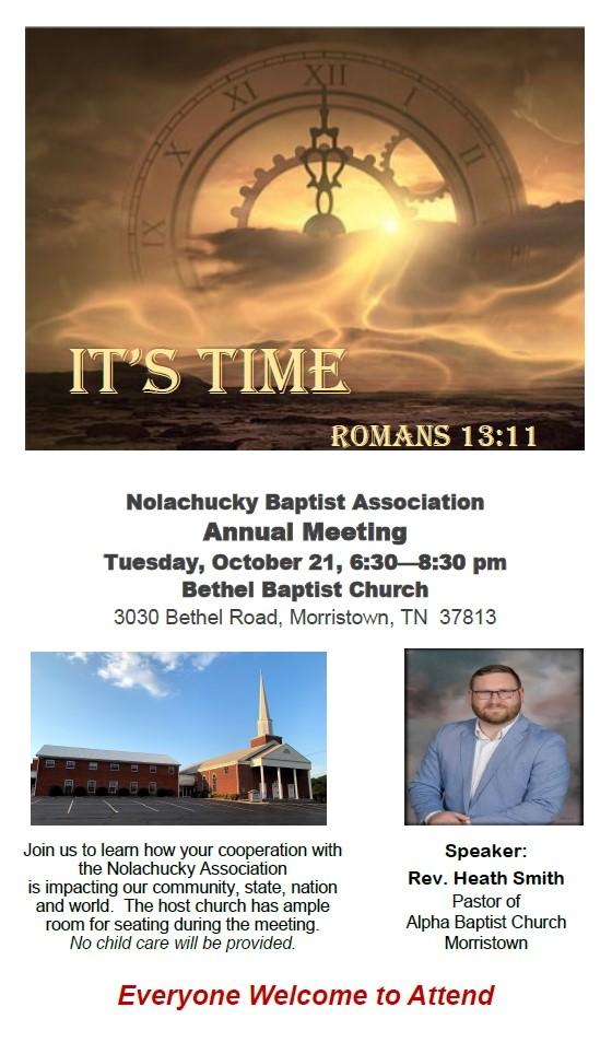 Nolachucky Baptist Association consists of 60 churches and missions that are located in Hamblen, Greene, Jefferson, Hawkins, and Cocke Counties in Northeast Tennessee. We currently have Hispanic congregations meeting at 1021 S. Cumberland Street and 1971 Buffalo Trail in Morristown and in White Pine and Jefferson City. Churches that offer a more contemporary style of worship are: Arrowhead Church, 4101 Maple Valley Road, Morristown; East Point Church, 630 Davy Crockett Parkway, Morristown (meeting at the BCM building on the Walters State College campus); and True Life, 860 E Hwy. 11E, Jefferson City near Jefferson Memorial Gardens. We also have a Micronesian church that meets at Barton Springs Church on E. Andrew Johnson Hwy in Morristown.